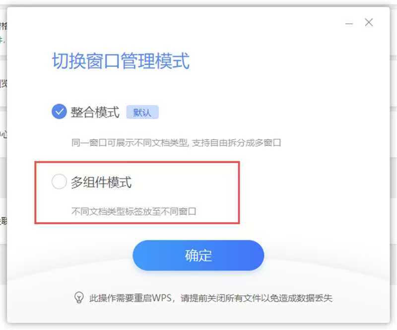 如下图所未:启动wps office后,在右上角找到”设置“,”其他“,”切换窗口管理模式“,选择”多组件模式“,确定即可。